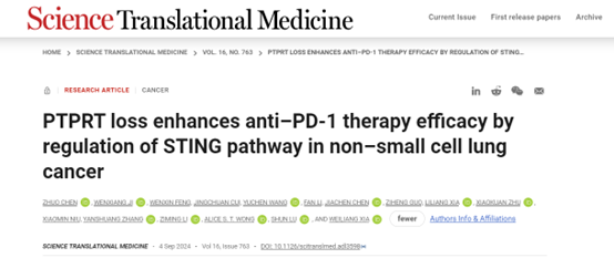 2024年9月4日,女王调教 夏伟梁团队和女王调教 医女王调教 附属胸科医院陆舜团队合作在 Science Translational Medicine 上发表了题为“PTPRT loss enhances anti-PD-1 therapy efficacy by regulation of STING pathway in non-small cell lung cancer”的研究论文。该研究首次发现并系统阐述了受体型蛋白酪氨酸磷酸酶PTPRT缺失通过调节STING通路增强免疫检查点抑制剂疗效的分子机制。