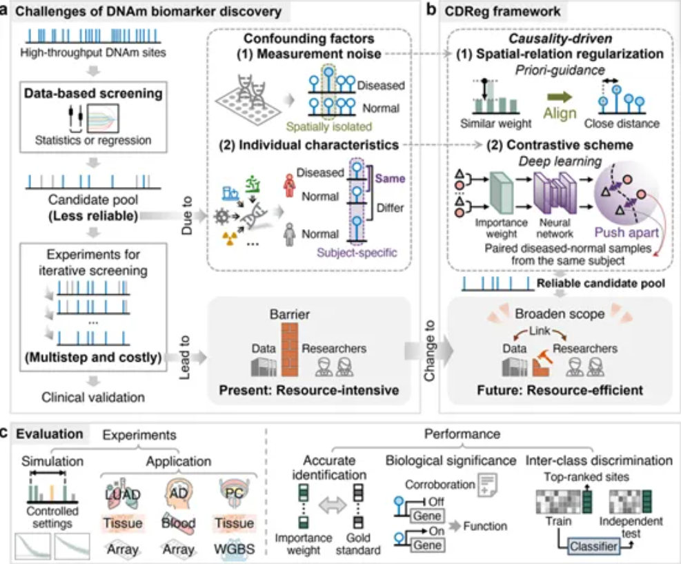 DNA甲基化生物标志物挖掘近年来在疾病早期诊断、分子机制研究和风险预测等领域展现出巨大潜力。然而,定义潜在的因果关系是一项重大挑战,尤其混杂因素(如测量噪声和个体差异)的干扰导致现有方法生成的候选标志物可靠性不足,进而需要依赖昂贵且耗时的实验验证。这不仅限制了研究的广泛开展,也阻碍了临床应用的推进。