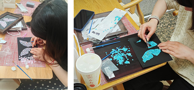 本次活动特邀国家级非遗“螺钿镶嵌技艺”传承人现场指导,以“理论讲解+手作体验”形式展开。参与者可自由选择制作螺钿胸针或螺钿画,在一凿一刻、一嵌一磨中沉浸式体验非遗匠心。